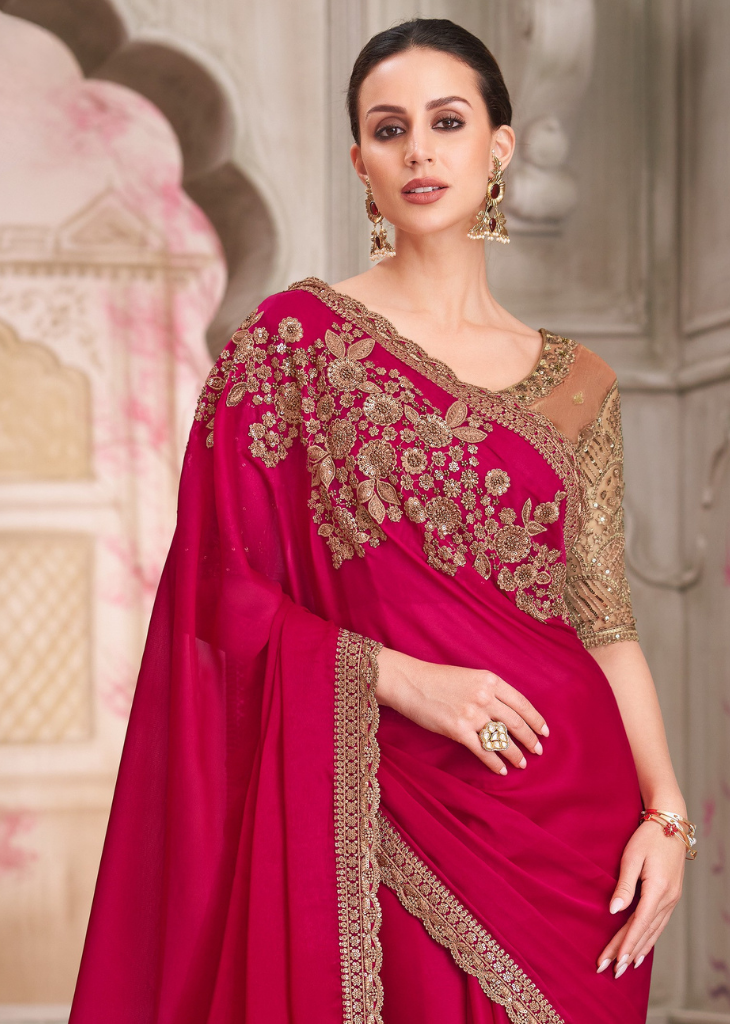 Grace your look with this cherry blossom pink satin silk saree, featuring a rich embroidered blouse. A stunning pick for weddings and festive soirées