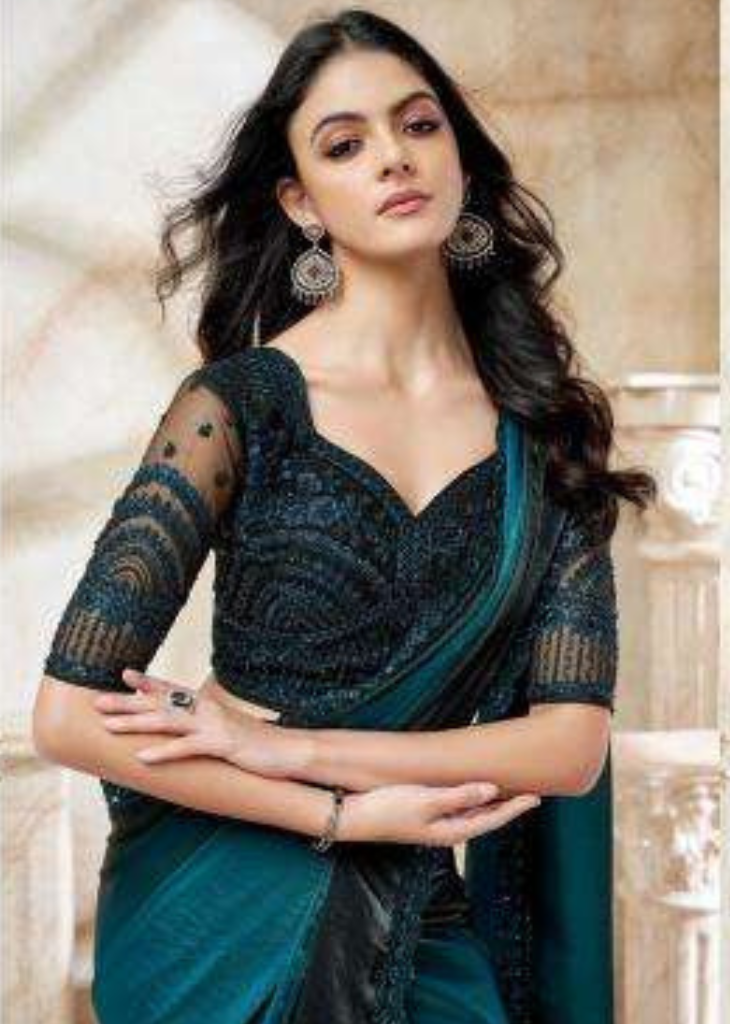 Drape yourself in elegance with this deep teal-blue Fendi digital saree enhanced by subtle black lacework. A sophisticated pick for weddings, receptions, and exclusive gatherings