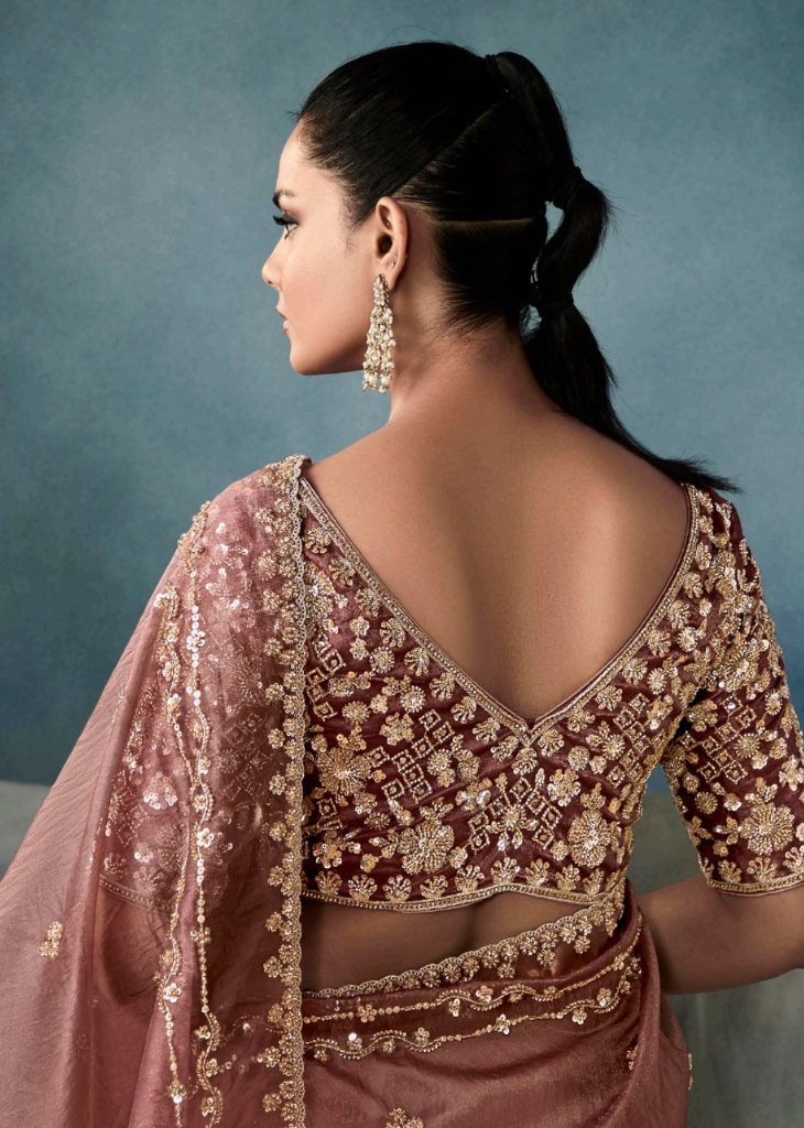 Graceful dusty rose tissue saree with elegant cutwork and sequin hand embroidery. Perfect for receptions or festive wear
