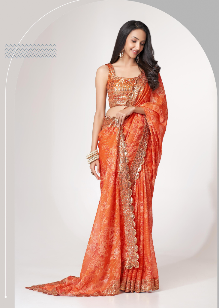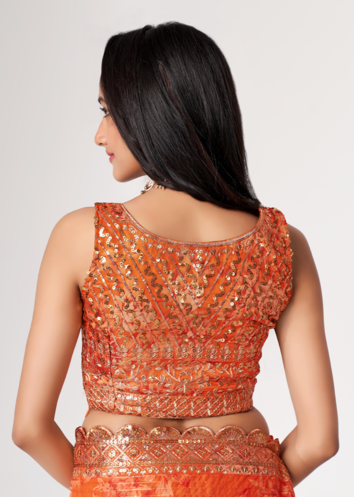 Vibrant orange saree with exquisite sequins embroidery and detailed digital print. Comes with a matching blouse, ideal for weddings & festive wear
