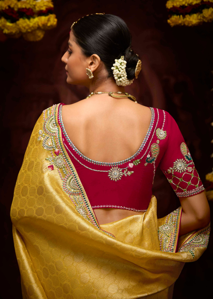 Shine bright in this golden silk saree, enriched with zari, stone, and embroidered border