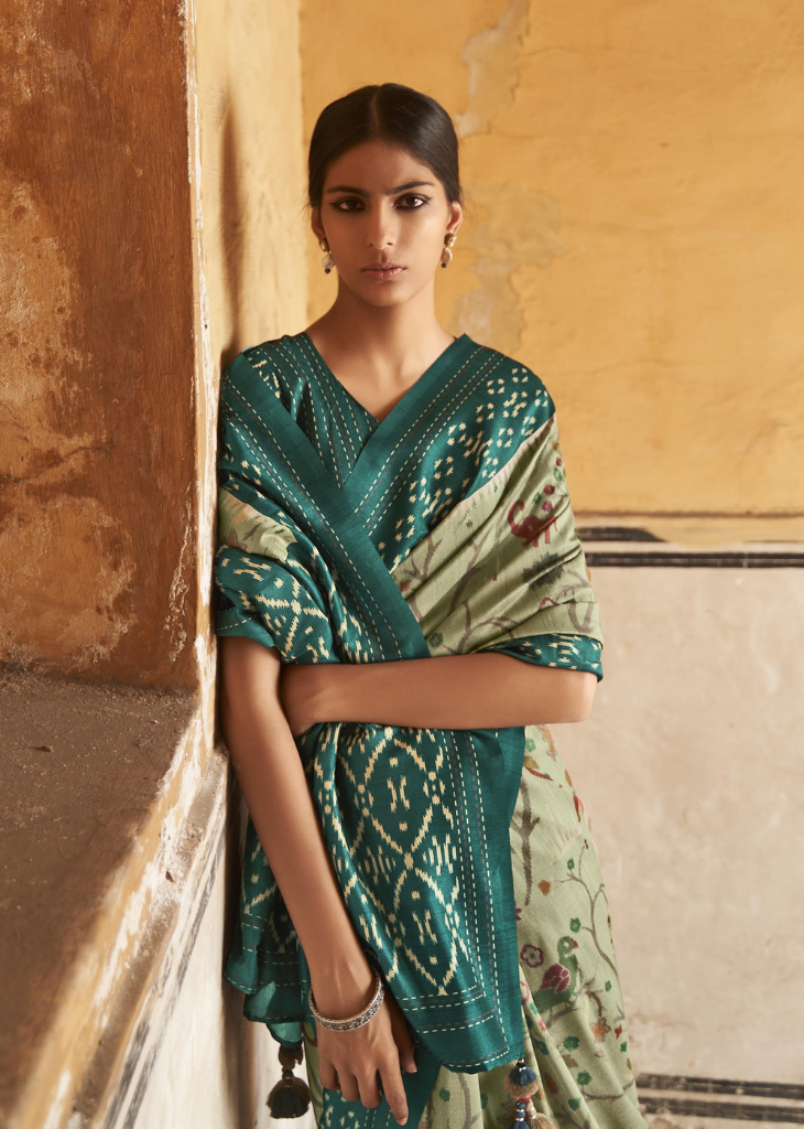 Graceful green smooth silk saree with ethnic peacock and flora ikat prints. Ideal for festive or cultural occasions