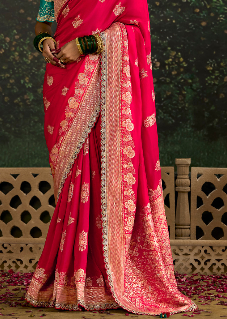 Rich maroon velvet saree with floral motifs, peach border, and teal blouse—perfect for bridal or festive elegance