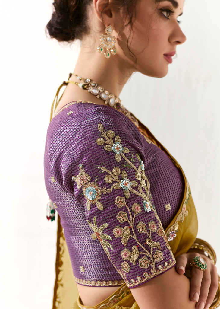 Subtle mustard saree matched with a stunning purple embroidered blouse—timeless style for festive celebrations