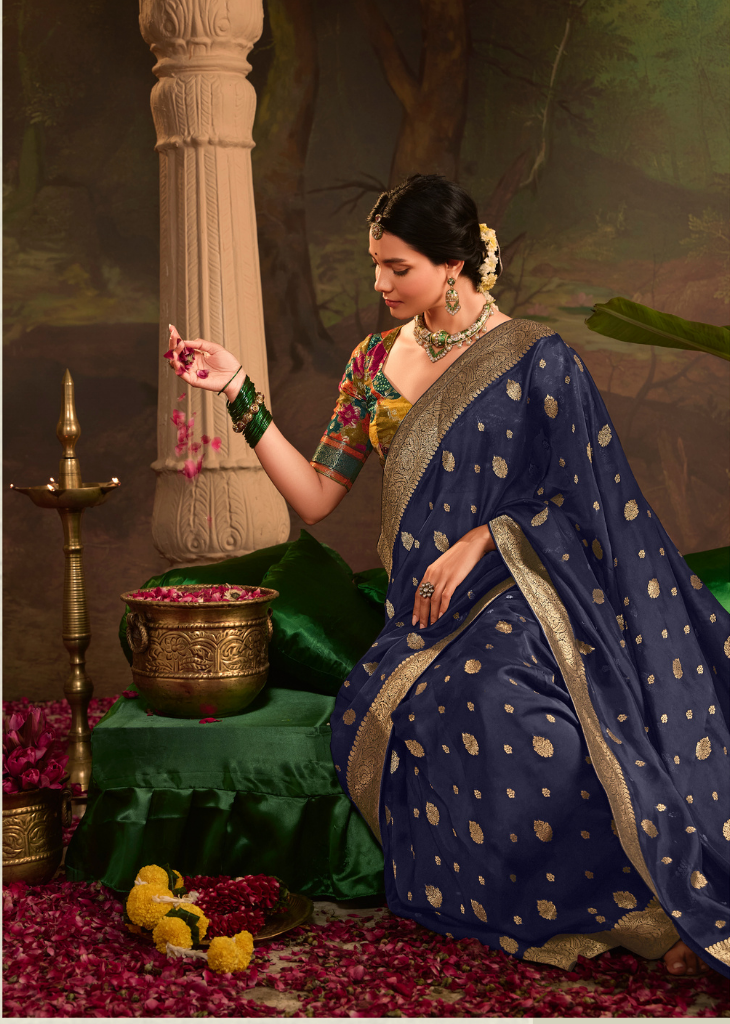 Luxurious navy blue saree in crepe dola silk with gold woven motifs and ornate border