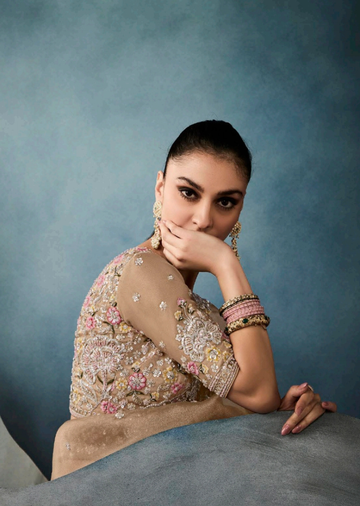 Nude gold shimmer saree with floral embroidery and designer blouse, ideal for receptions, parties, and festive looks