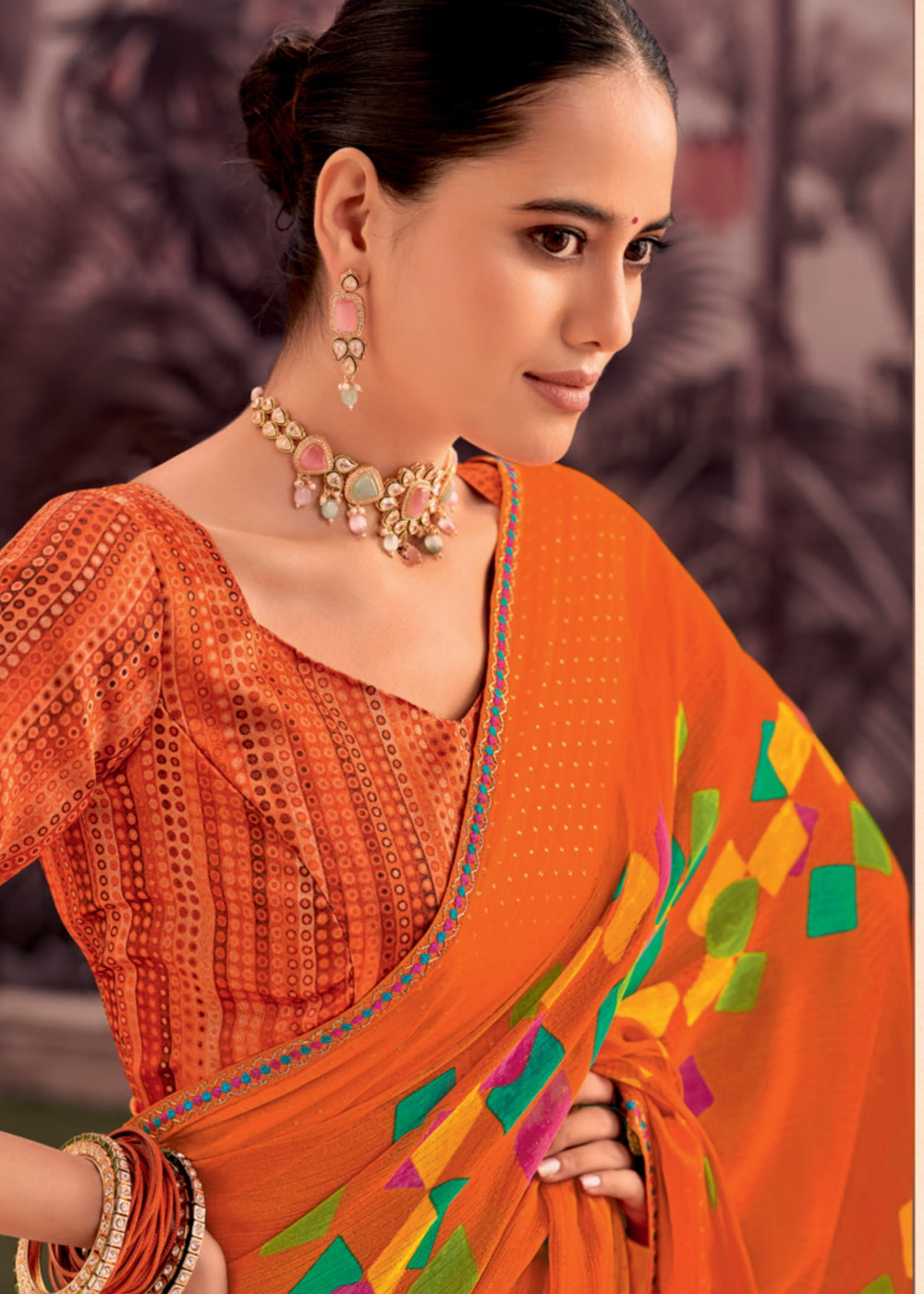 Striking orange georgette shimmer saree with vibrant cube motifs. Ideal for festive occasions, cultural events & casual gatherings