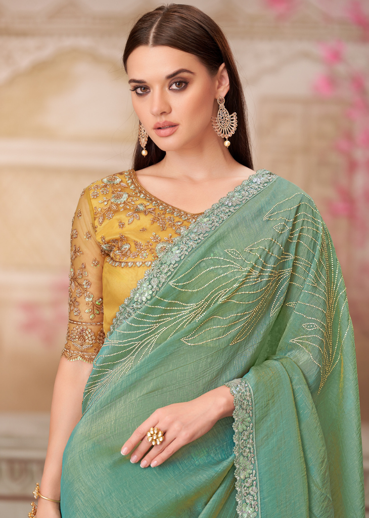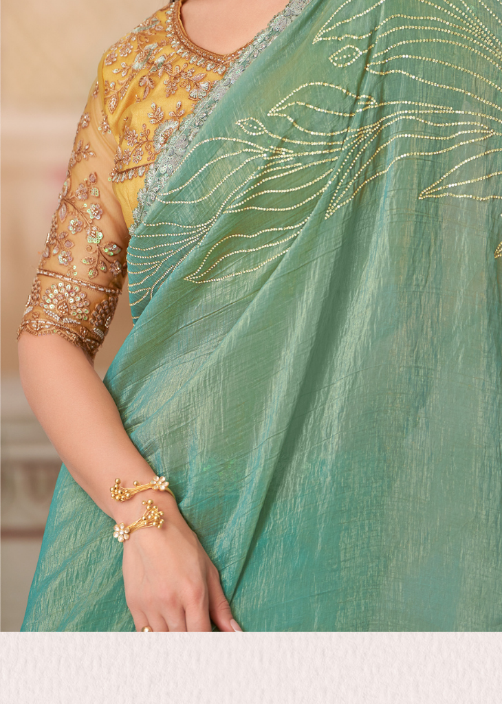 Stay effortlessly elegant in this pista green satin silk saree paired with a striking golden blouse. Perfect for haldi, mehndi, and summer festivities