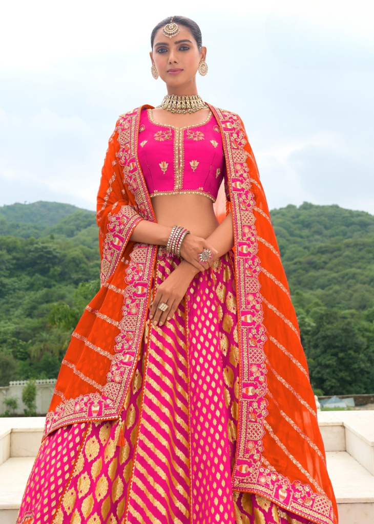Bold and festive, this rani pink lehenga is crafted in Banarasi silk and paired with an orange embroidered dupatta. A vibrant wedding look