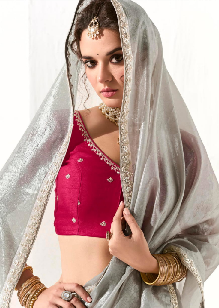 Elegant grey tissue saree paired with rich wine floral blouse—perfect for receptions, sangeet, and cocktail evenings
