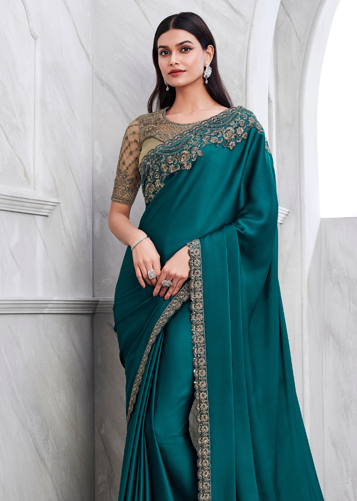Grace meets glamour in this walnut green silk saree, complemented by a uniquely crafted antique golden blouse. The classic embroidery and soft drape elevate your festive look with rich detailing and timeless beauty. Ideal for traditional functions