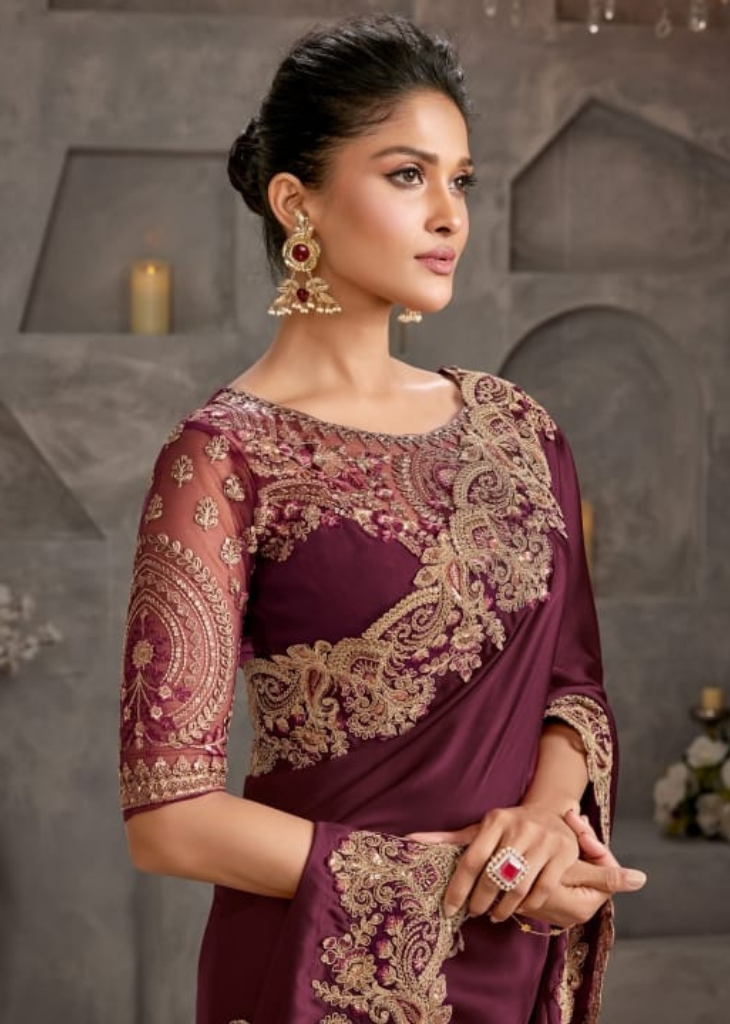 Step into luxury with this wine soft silk saree adorned in antique embroidery. Perfect for receptions, it blends richness and comfort in one graceful drape