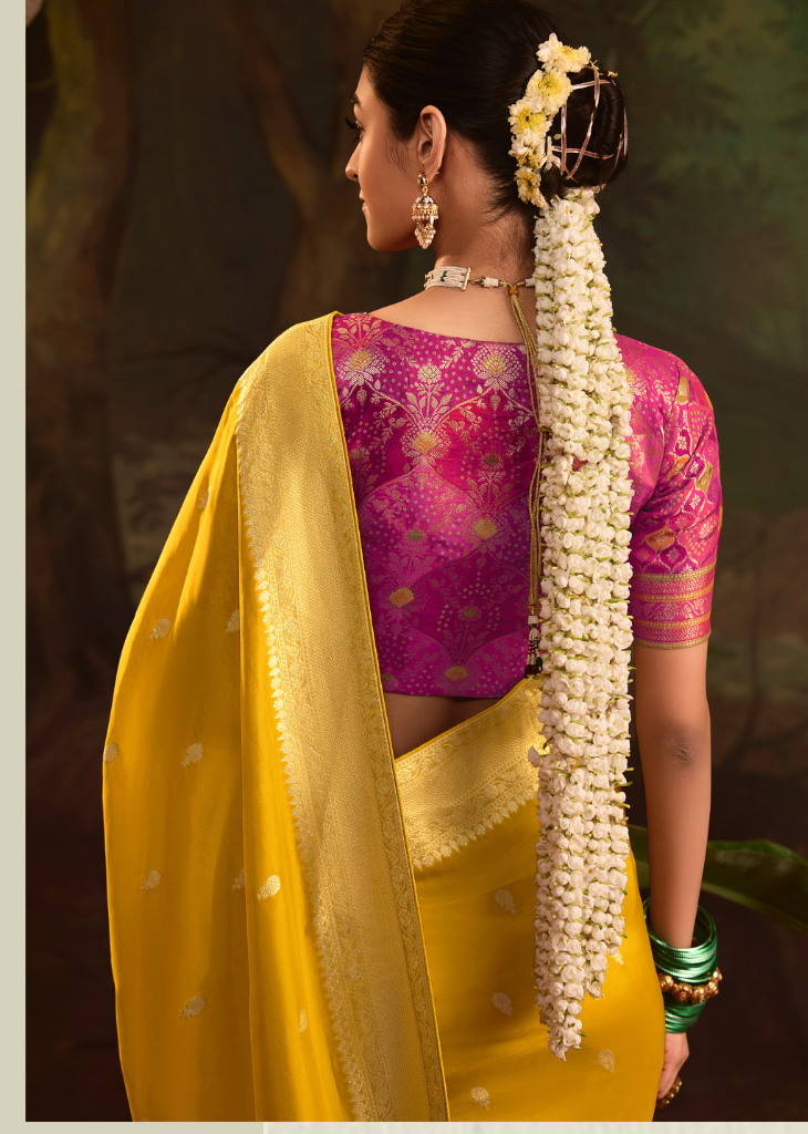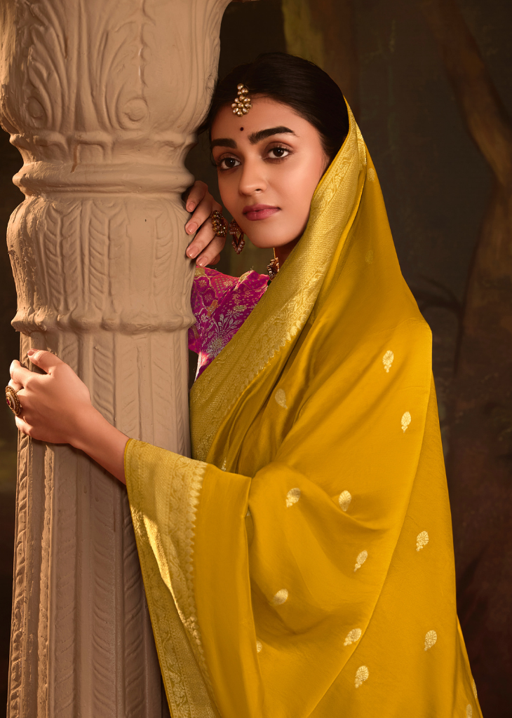 Elegant yellow dola silk saree with woven golden border, perfect for festive and traditional wear
